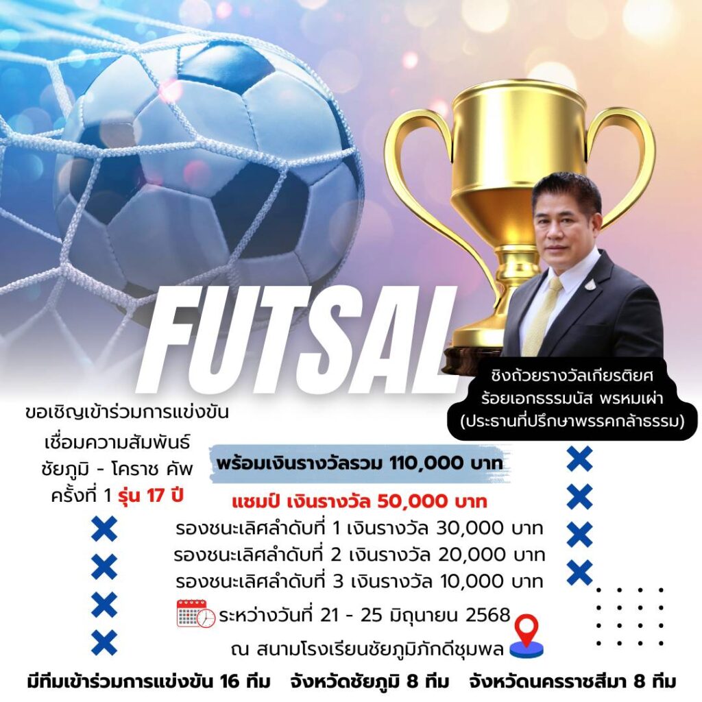 ชัยภูมิเตรียมจัดการแข่งขันฟุตซอลเยาวชน “ชัยภูมิ – โคราช คัพ” ครั้งที่ 1 รุ่นอายุไม่เกิน 17 ปี ชิงถ้วย รางวัลพร้อมเงินรางวัลรวมกว่า 110,000 บาท