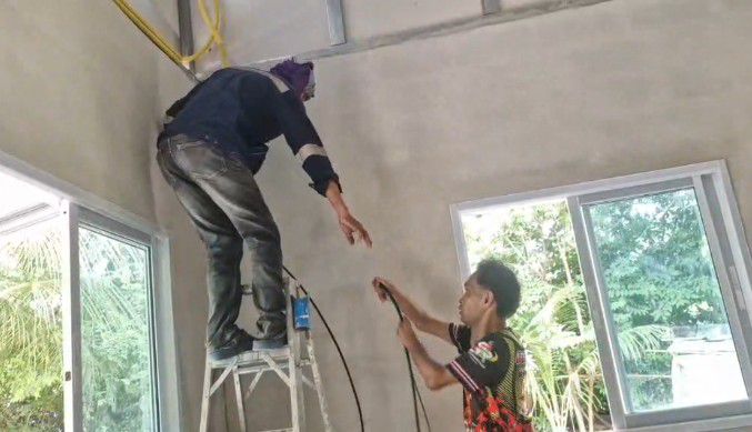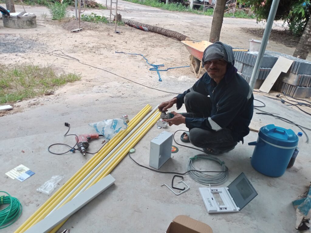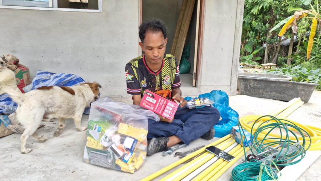 นายทวิน สมงาม เล่าว่า เดิมทีตนทำงานที่กรุงเทพ รับเหมาทำเดินระบบไฟภายในบ้านโดยรับช่วงต่อจากบริษัทที่รับเหมามาอีกที เพิ่งกลับมาอยู่บ้านเกือบ2ปี ตนจบเเค่ชั้นป.6 ออกจากบ้านไปทำงานตั้งเเต่อายุ13ปี จากพี่ๆคนในหมู่บ้านชวนไปทำงาน โดยการเป็นลูกมือ เป็นผู้ช่วย เเล้วเเต่รุ่นพี่จะเรียกใช้ เรียนครูพักลักจำมา สะสมประสบการณ์อยู่นานหลายปี จึงตัดสินใจมารับงานเอง สาเหตุที่กลับมาอยู่บ้าน รู้สึกอิ่มตัวจากสังคมเมือง อยากกลับมาอยู่ มารับทำไฟตามผู้ว่าจ้าง เเม้รายได้จะไม่มากเเต่ก็พออยู่ได้เเต่สบายใจที่ได้กลับมาอยู่บ้าน ข้าวก็ไม่ต้องซื้อบ้านก็ไม่ต้องเช่า วันนี้พานายพูนสิน ยั่งยืน(เสื้อกีฬาสีเเดง)มาช่วยทำงานด้วย ซึ่งเขาเป็นผู้พิการทางขา เเละมีอาชีพช่างซ่อมเครื่องใช้ไฟฟ้า/เดินระบบไฟในบ้านเช่นกัน เป็นคนมีฝีดี เเละพูดน้อย พูดไม่เก่ง เลยให้เขามาช่วยทำงานด้วย เป็นงานที่ทำค้างไว้ก่อนจะเกิดเหตุการณ์ปะทะจนต้องอพยพ อย่างไรก็ตามหากพื้นที่ใกล้เคียงสนใจวางระบบไฟภายในบ้าน ก็สามารถติดต่อมาได้ที่ เบอร์ โทร 085-635-583-4 นายทวิน สมงามเเละนายพูนสิน ยั่งยืน.