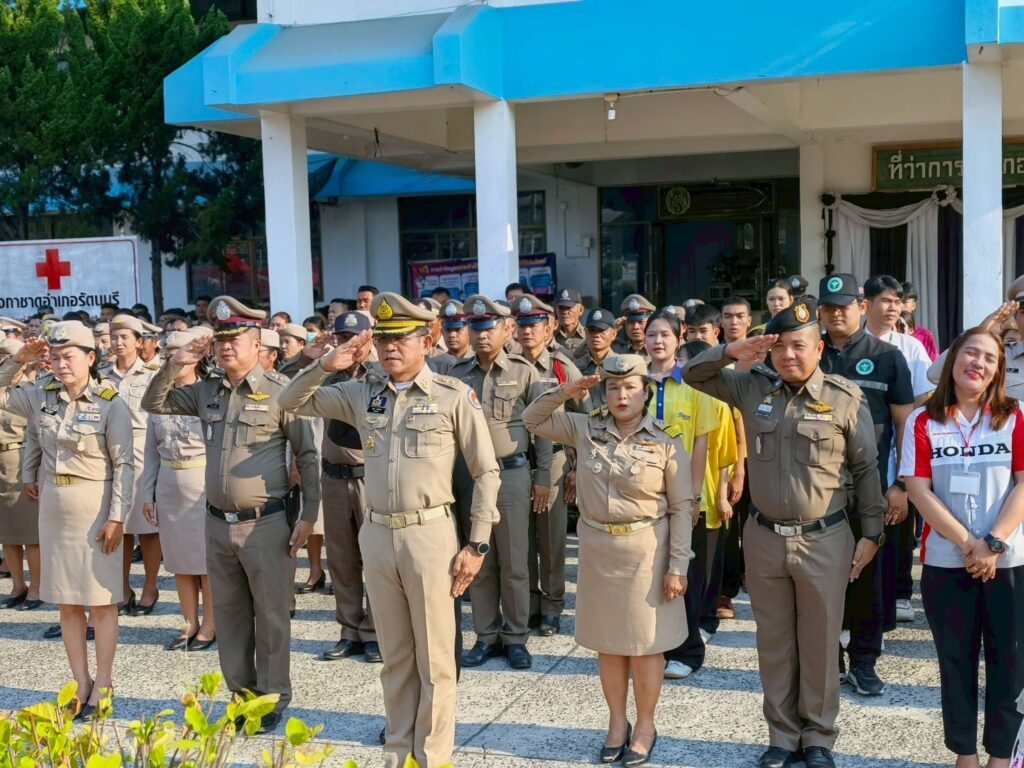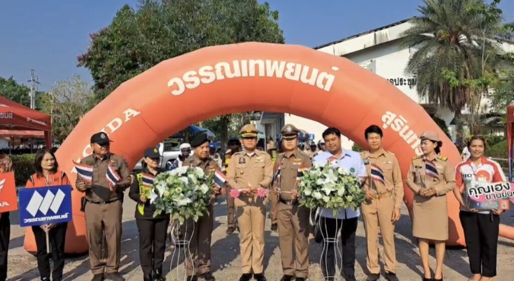 วันนี้ ( 2 เม.ย. 2569) เวลา 08.00 น. พ.ต.อ.คารม บุญสด ผกก.สภ.รัตนบุรี , พ.ต.ท.ธนรัฐ รอบรู้ รอง ผกก.ป.ฯ พ.ต.ท.พรชัย สุขดี สวป.ฯ ได้นำข้าราชการตำรวจ สภ.รัตนบุรี เคารพธงชาติ พร้อมด้วยหัวหน้าส่วนราชการอำเภอรัตนบุรี ผู้นำชุมชน และประชาชนอำเภอรัตนบุรี เพื่อร่วมกิจกรรมรณรงค์ป้องกันและลดอุบัติเหตุทางถนนช่วงเทศกาลสงกรานต์ ประจำปี 2569 พร้อมทั้งแจกหมวกกันน็อค ใบปลิว และเผยแพร่สื่อรณรงค์ให้ประชาชนขับขี่รถอย่างปลอดภัยให้ปฏิบัติตามกฎหมายอย่างเคร่งครัด เพื่อป้องกันและลดอุบัติเหตุทางถนน โดยมี พันจ่าเอกสุวิน ห้องแซง นายอำเภอรัตนบุรี เป็นประธาน ณ หน้าที่ว่าการอำเภอรัตนบุรี ต.รัตนบุรี อ.รัตนบุรี จ.สุรินทร์