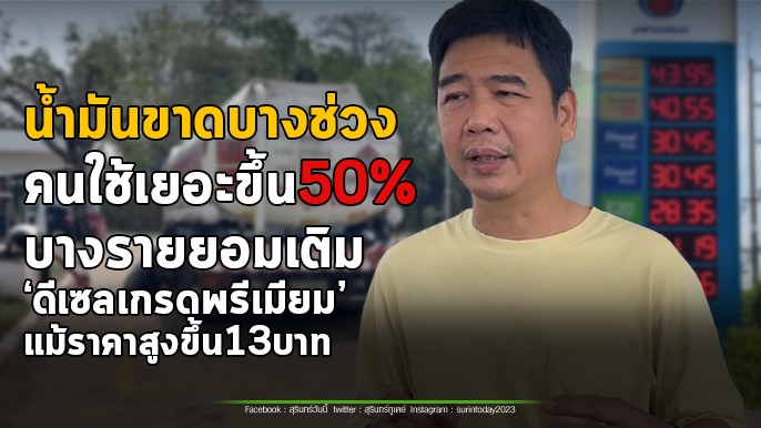 ข่าวทั่วไป 17 มีนาคม 2026 สุรินทร์ทูเดย์ บางราย ยอมเติม! ดีเซลเกรดพรีเมียม แม้ราคาจะสูงกว่าดีเซลธรรมดาถึง 13 บาท ผจก.ยอมรับ น้ำมันขาดบางช่วง เพราะลูกค้าเติมมากขึ้นประมาณ 50% สุรินทร์ สถานการณ์น้ Read More